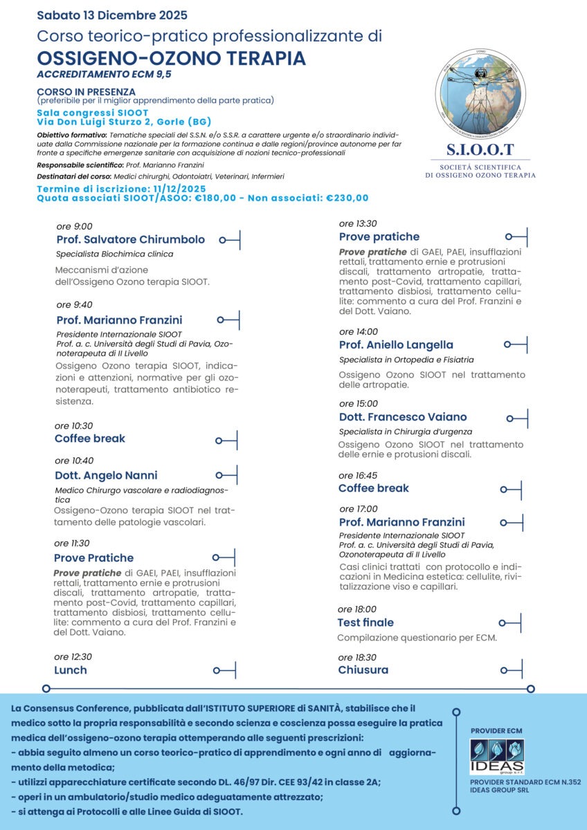 Corso teorico pratico di Ossigeno-ozono terapia SIOOT 9,5ECM – 13 DICEMBRE 2025 – MODALITΓ€: IN PRESENZA